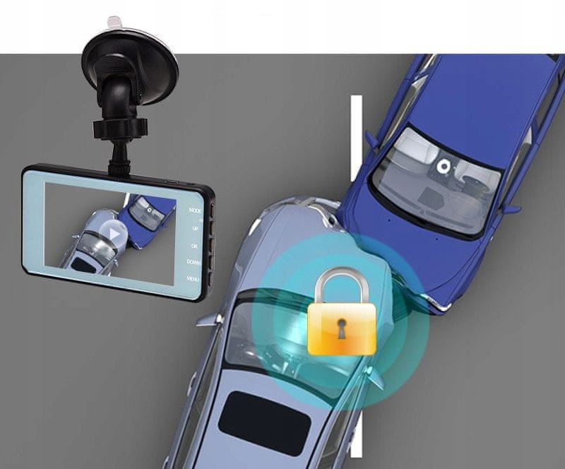 Zadnja kamera našega kompleta ne samo da snema slike med vožnjo, temveč vam omogoča tudi uporabo funkcije pomočnika pri vzvratni vožnji. Po pravilni namestitvi se bo slika iz zadnje kamere prikazala na zaslonu snemalnika, ko prestavite v vzvratno prestavo! Ta funkcija olajša parkiranje in navigacijo na ozkih in težko dostopnih mestih.
