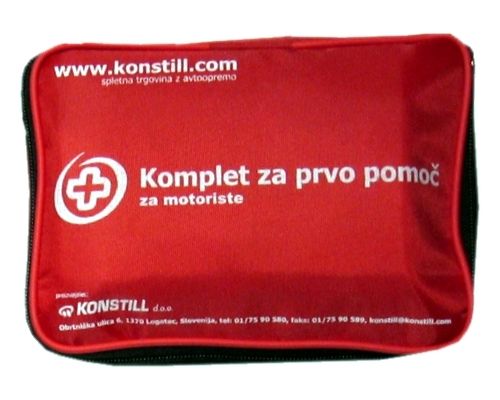 Komplet vsebuje osnovne pripomočke za nudenje prve pomoči in oskrbo poškodovancev v prometnih nesrečah. Je v skladu z Zakonom o motornih vozilih in v skladu s Pravilnikom o kompletu za prvo pomoč, ki spada v obvezno opremo motornih vozil.