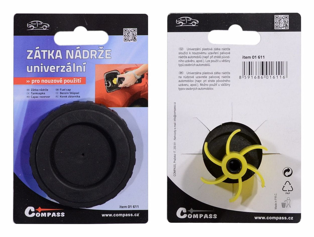 Univerzalni plastični zamašek za rezervoar, ki se uporablja za zasilno zapiranje rezervoarja za gorivo v avtomobilih (npr. v primeru izgube originalnega pokrovčka itd.). Uporablja se lahko za večino vrst osebnih avtomobilov. Celoten opis