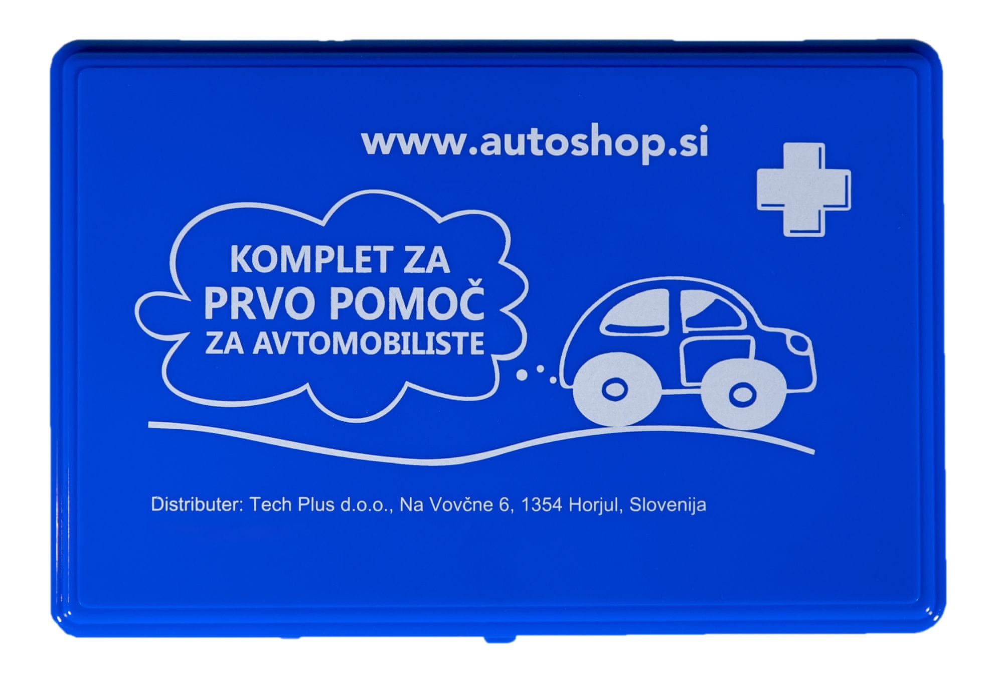 Komplet za prvo pomoč za avto vsebuje:– prvi povoj, tip 2 10 cm x 4 m, sterilen, 3 kom,– prvi povoj, tip 3 12 cm x 5 m, sterilen, 1 kom ,– aluplast za opekline 9 × 15 cm, sterilen, 1 kom,– aluplast za opekline 50 × 80 cm, sterilen, 1 kom,– kompresa 5 × 5 cm, sterilna, 10 kom,– kompresa 10 × 10 cm, sterilna, 6 kom,– povoj iz raztegljive tkanine 8 cm x 4 m, 2 kom,– povoj iz raztegljive tkanine 10 cm x 4 m, 1 kom,– trikotna ruta 100 × 100 × 140 cm, 3 kom,– rokavica (sist en 455–1 in 2:2000), 4 kom,– zaščitna folija za umetno dihanje, 1 kom,– dvostranska metalizirana folija 210 × 160 cm debeline najmanj 0,0012 mm = 12 µm, 1 kom,– škarje (z zaobljeno konico), 1 kom,– obliž z blazinico 10 × 8 cm, 5 kom,– obliž 2,5 cm x 5 m, 1 kom,– navodila za nudenje prve pomoči, 1 kom.