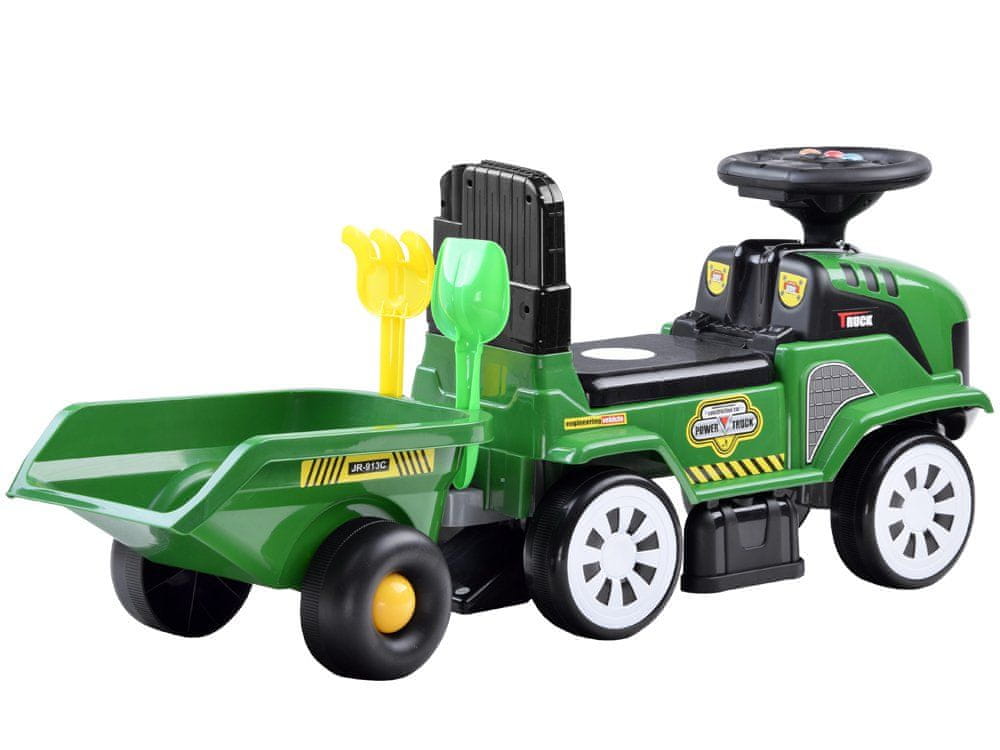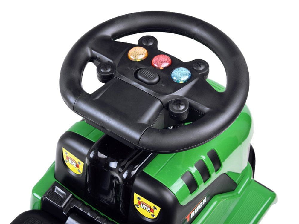 Fantastičen traktor/vozilo kot nalašč za prvo vozilo vsakega malega ljubitelja štirikolesnikov. Vozilo je v celoti izdelano iz visokokakovostne plastike v intenzivnih barvah. Vstopanje in izstopanje iz traktorja otroku ne bo predstavljalo težav, sedež z naslonjalom pa bo omogočal udobno in varno vožnjo. Zaradi posebnega mehanizma za zaklepanje voznik med igro ne bo mogel skočiti nazaj.