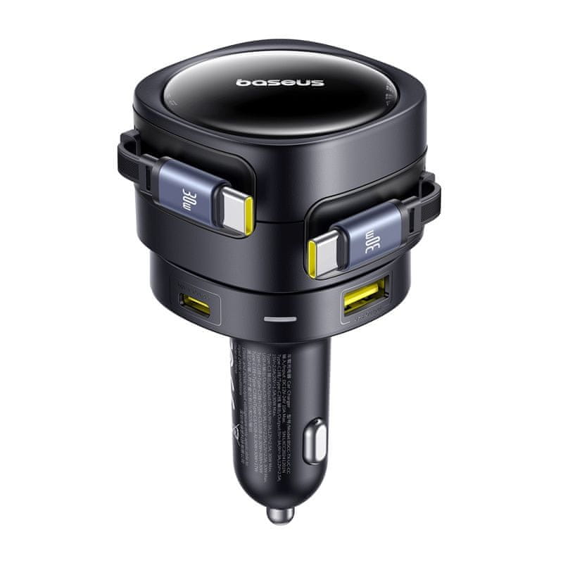 Avtomobilski polnilnik Baseus z dvema vgrajenima kabloma USB-C in dvema dodatnima vtičnicama (USB-C in USB-A) omogoča hkratno polnjenje do štirih naprav s skupno močjo do 90 W. Integriran varnostni sistem, vrtljiva konstrukcija in združljivost z napetostjo 12–24 V zagotavljajo zanesljivost v vsakem vozilu.