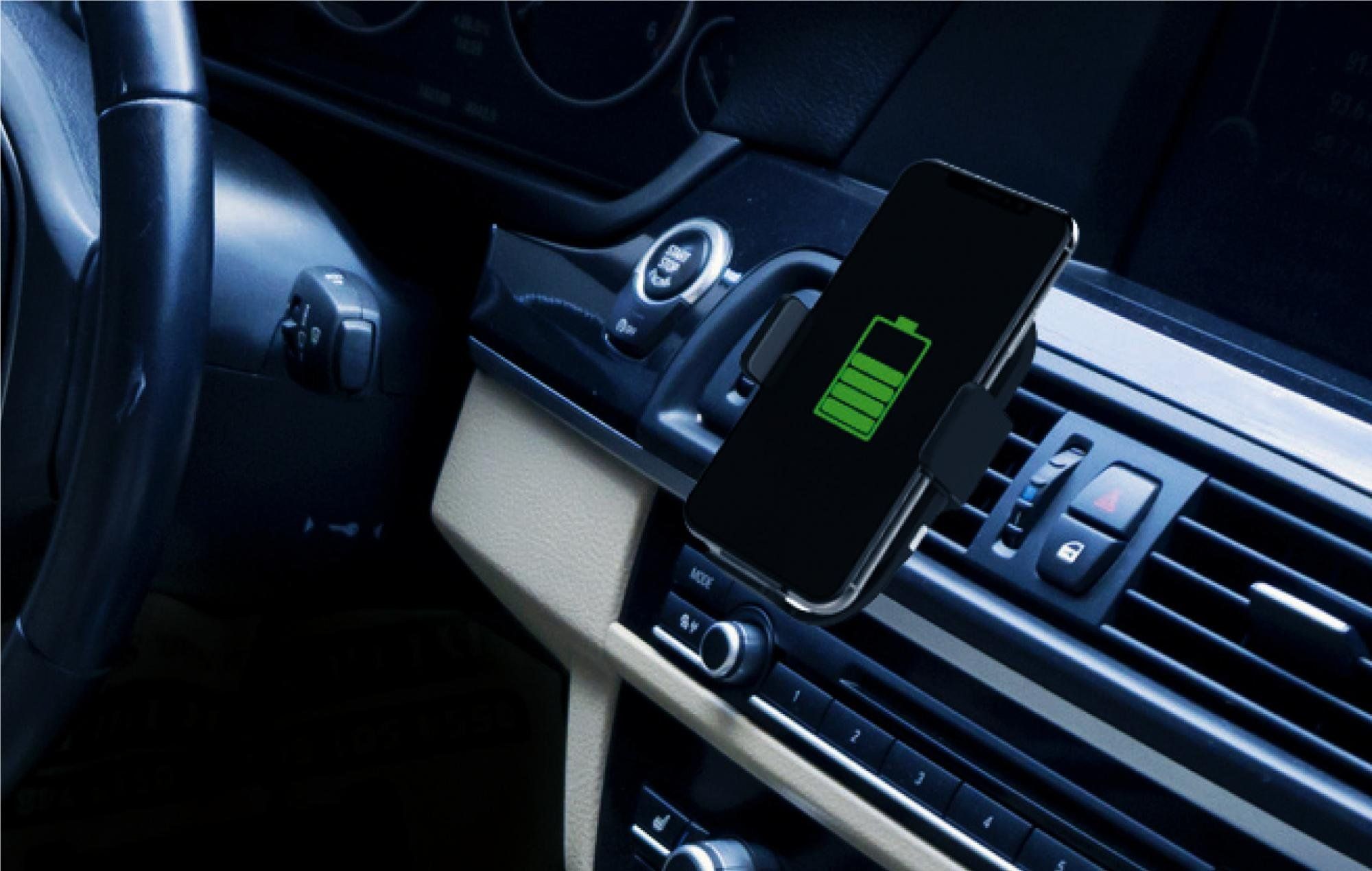 Polnilno stojalo omogoča brezžično polnjenje vašega pametnega telefona, ki podpira tehnologijo Qi – brezžičnega polnjenja. Preprosto namestite pametni telefon v držalo. Telefon se bo pričel polniti, ne da bi ga morali povezati s kablom, kot ste bili navajeni do sedaj. Nosilec za telefon, ki ga namestite v prezračevalne reže vašega vozila, je opremljen z vrtljivo glavo 360° in vam omogoča postavitev telefona v položaj, ki vam omogoča, da se boste med vožnjo počutili čimbolj prijetno.