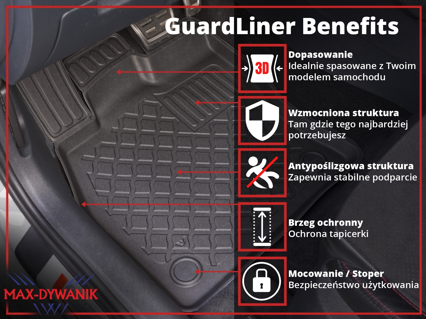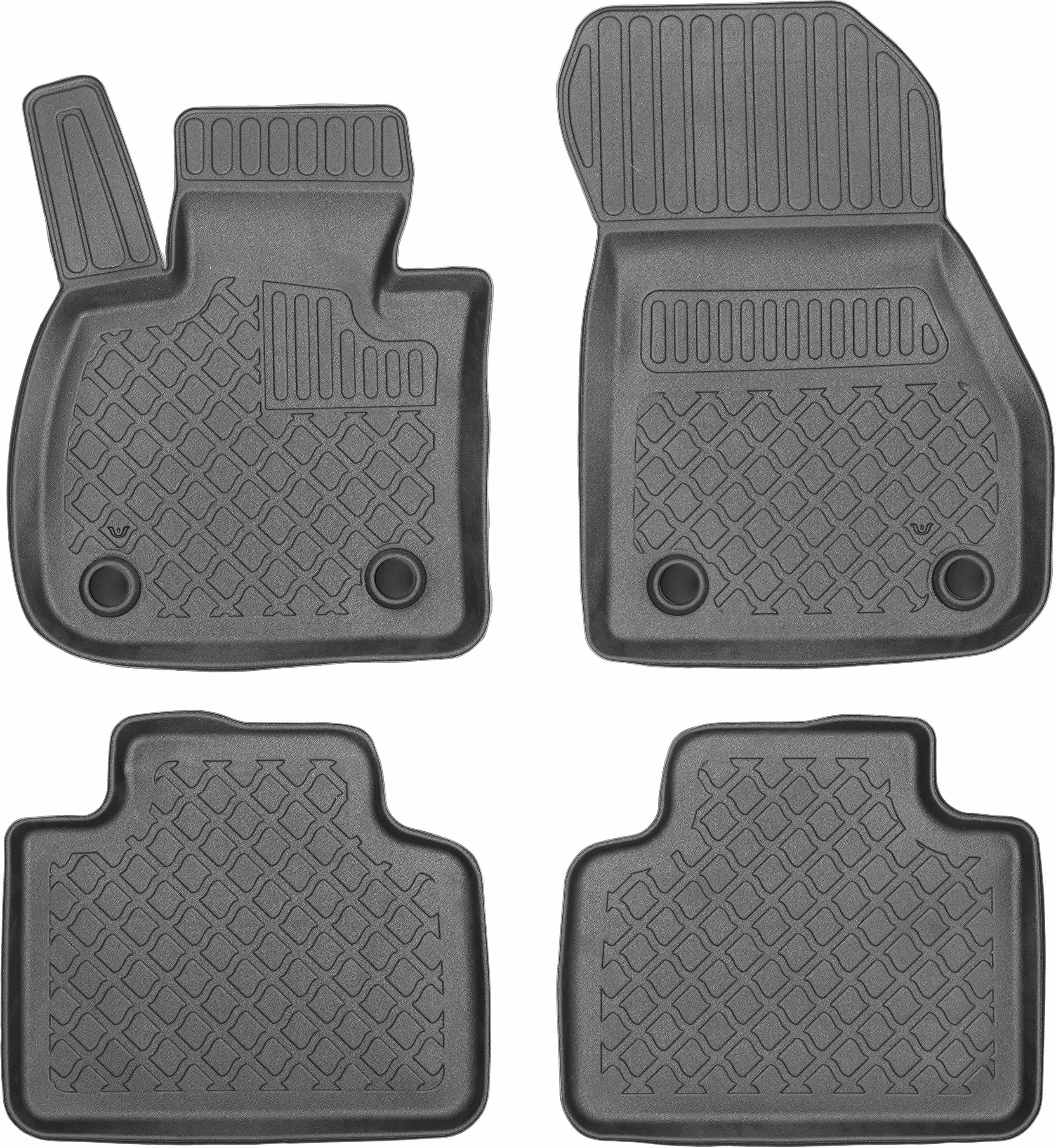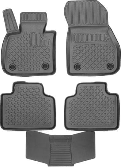 Ponujene talne obloge so bile natančno zasnovane glede na obliko talne obloge, pri čemer so upoštevali ne le znamko/model avtomobila, temveč tudi letnik in različico karoserije, zaradi česar se popolnoma prilegajo. Podloge so izdelane iz najkakovostnejše, trpežne in ojačane plastike, brez snovi, škodljivih za zdravje, kar zagotavlja varno uporabo. Visok zaščitni ovratnik (rob) učinkovito zadržuje vodo in umazanijo ter ščiti originalno avtomobilsko oblazinjenje pred umazanijo. Varna za uporabo, zahvaljujoč praktičnemu in enostavnemu sistemu pritrditve na tla avtomobila. Sistem pritrditve je prilagojen znamki/modelu avtomobila in preprečuje drsenje predpražnika med vožnjo. Mat zaključek in prefinjen vzorec površine zagotavljata, da so predpražniki v vašem avtomobilu estetsko privlačni.