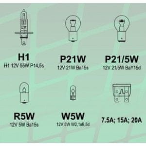 Univerzalni komplet H7 servisnih žarnic in varovalk v plastični škatli. Komplet je sestavljen iz najpogostejših nožnih varovalk in 12V žarnic. Celoten opis