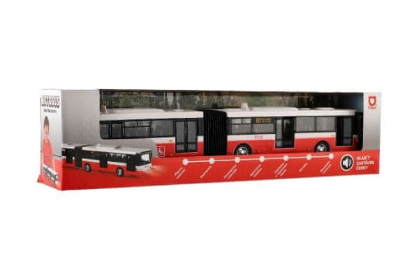 Podroben model s svetlobnimi in zvočnimi učinki, srednji del avtobusa je v sklepu gibljiv. Ročno odpiranje sprednjih vrat napoveduje postajališča (glavna postaja, vodni park, živalski vrt, športni stadion, osnovna šola in vrtec, gledališče, nakupovalni center). Češka različica bo zagotovo navdušila mlade in stare ljubitelje modelov. 3× baterije LR44/AG13, baterije so vstavljene Velikost avtobusa: 36 cm 40 × 10 × 7,5 cm