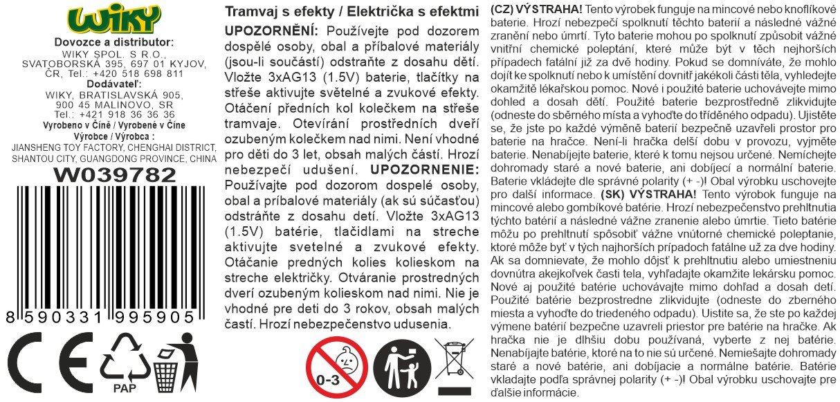 Tramvaj z učinki. Dimenzije 42×6,5×9 cm. Brez koles. Ustvarja svetlobne in zvočne učinke, ki se aktivirajo z gumbi na strehi. Vključene baterije 3×AG13 (LR44 1,5 V). Obračanje sprednjega kolesa s kolesom na strehi. Odpiranje srednjih vrat z zobatim kolesom nad njimi.