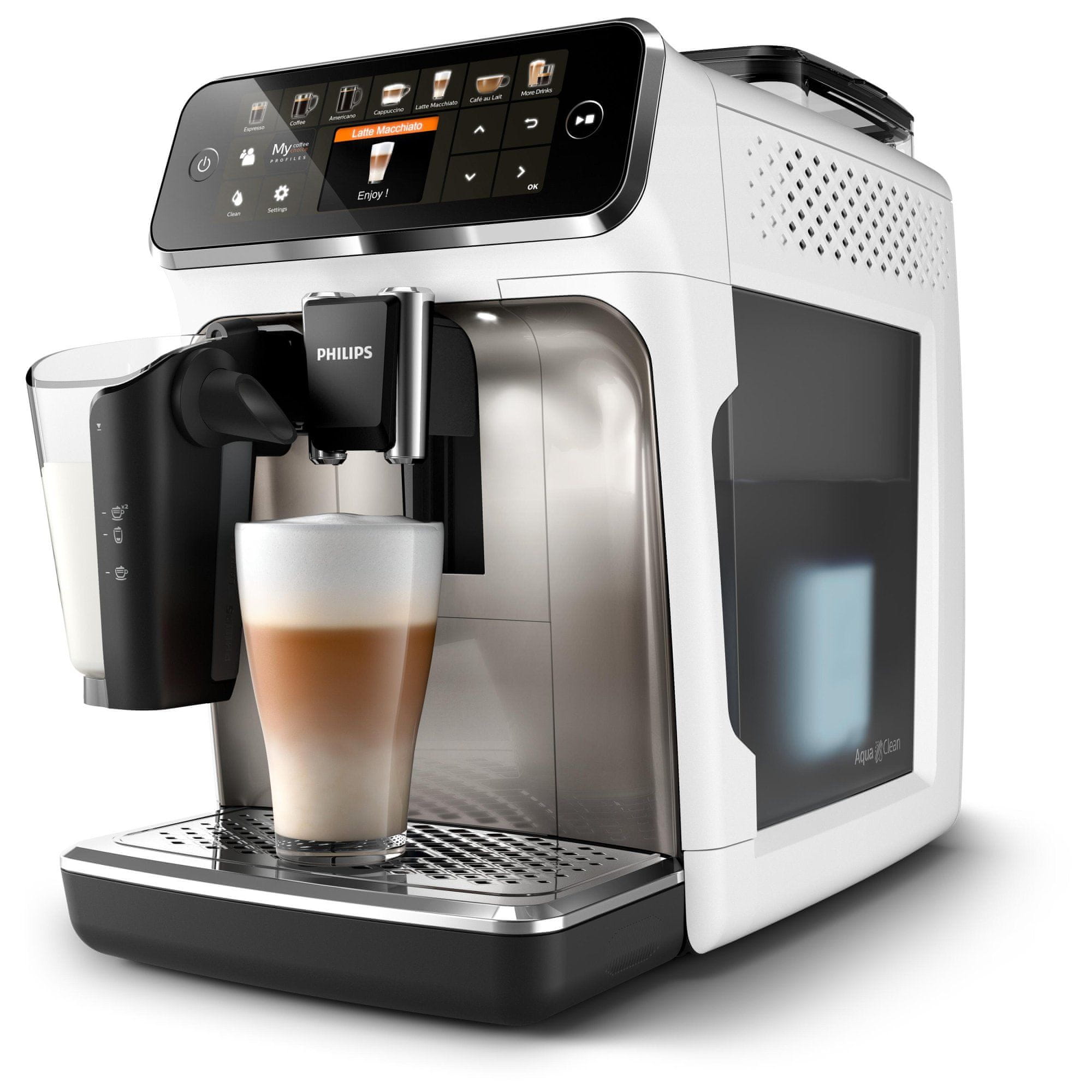 Avtomatski kavni aparat z inovativno posodo za mleko LatteGo. Philips EP5443/90 Series 5400 LatteGo ponuja 12 kavnih napitkov z enim dotikom, patentirane keramične mlinčke in odstranljivo enoto za kuhanje. Praktične nastavljive funkcije in shranjevanje 4 uporabniških profilov. Celoten opis