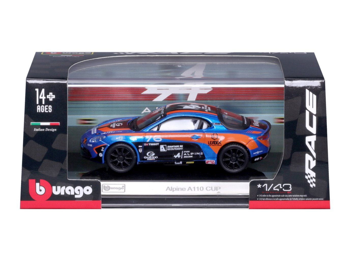 Kovinski model dirkalnika – Bburago 1:43 Racing Alpine A110 CUP v dekorativni škatli Celoten opis