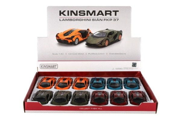 Krasen kovinski model Lamborghini Sián FKP 37 v merilu 1:40. Avtomobil ima odpirajoča se vrata in je obrnljiv. Na voljo v štirih barvnih različicah. Velikost avtomobila je 13 cm. Primeren za otroke od 3. leta starosti dalje