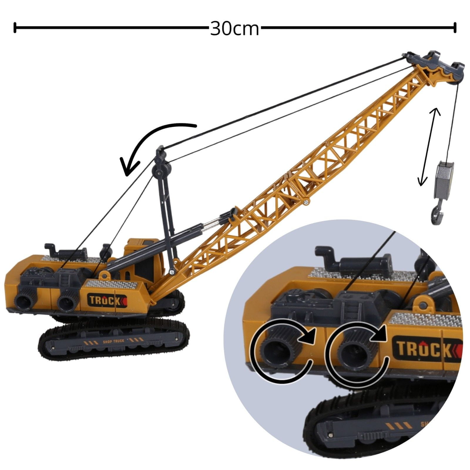 - Dimenzije izdelka: žerjav-37×60×23cm, buldožer-19×8×7cm, gosenični žerjav-27×30×8cm, bager-26×10×8cm, mešalnik betona-16×8×4cm, tovornjak-16×6×4cm.