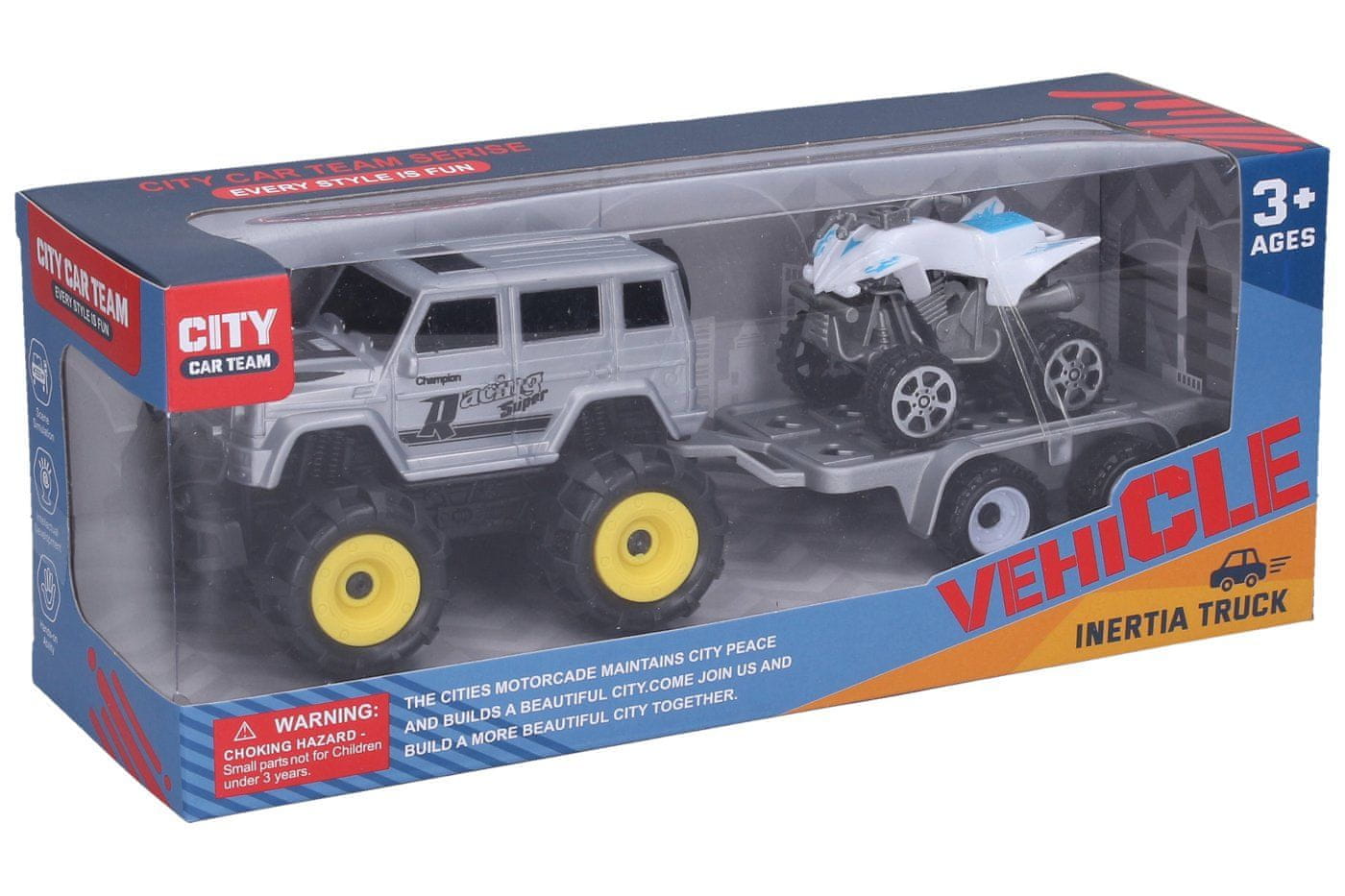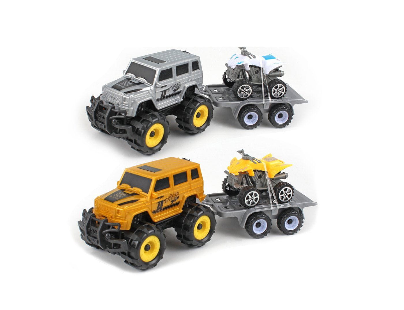 Auto off-road s štirikolesnikom 25 cm. Avto na vztrajniku, prikolica in štirikolesnik brez koles. 2 različici – siva, rumena.