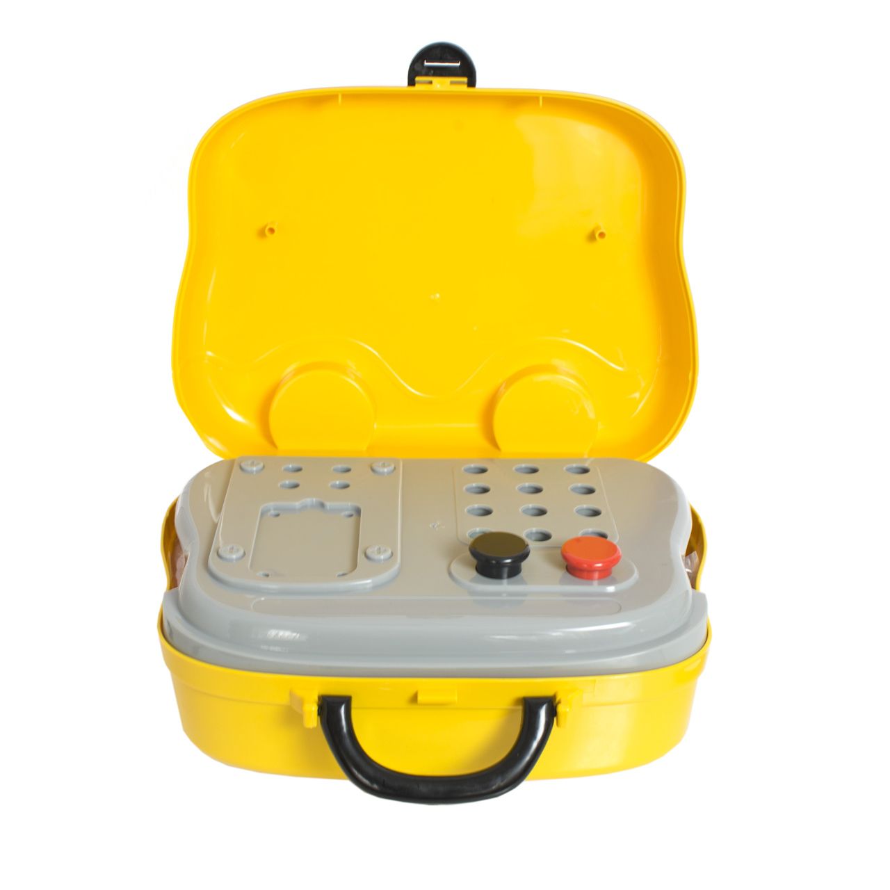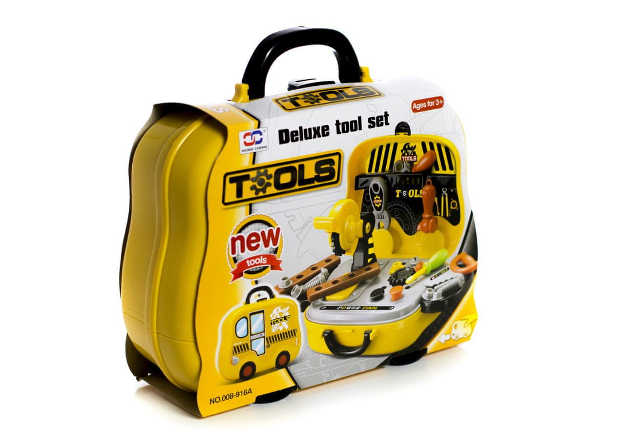 DELOVNIŠKI SET Z DODATKI V KADRETU Delavniški set z dodatki v kovčku v obliki avtobusa. Popolna igrača za malega mojstra. Kovček je opremljen s priročnim ročajem, zato ga lahko otrok vzame s seboj kamor koli. Kovček ima kolesa. Odlična ideja za darilo. Vaš otrok bo navdušen. Komplet vsebuje: kovček zobniki kladivo ključ 2 izvijača 2 deski 6 vijakov in matic žaga komplet nalepk stranske police komplet nalepk Dimenzije kovčka: 24,5 cm x 17 cm x 8 cm Odlična igrača za otroke od 3. leta starosti.