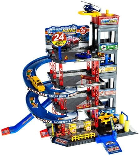 GARAŽNA HIŠA – je odlična igrača za vsakega avtomobilskega navdušenca. Komplet vključuje parkirišče z dvigalom in avtopralnico ter stebričke, ovire in prometne znake. Vključeni so tudi avtomobili in helikopter.