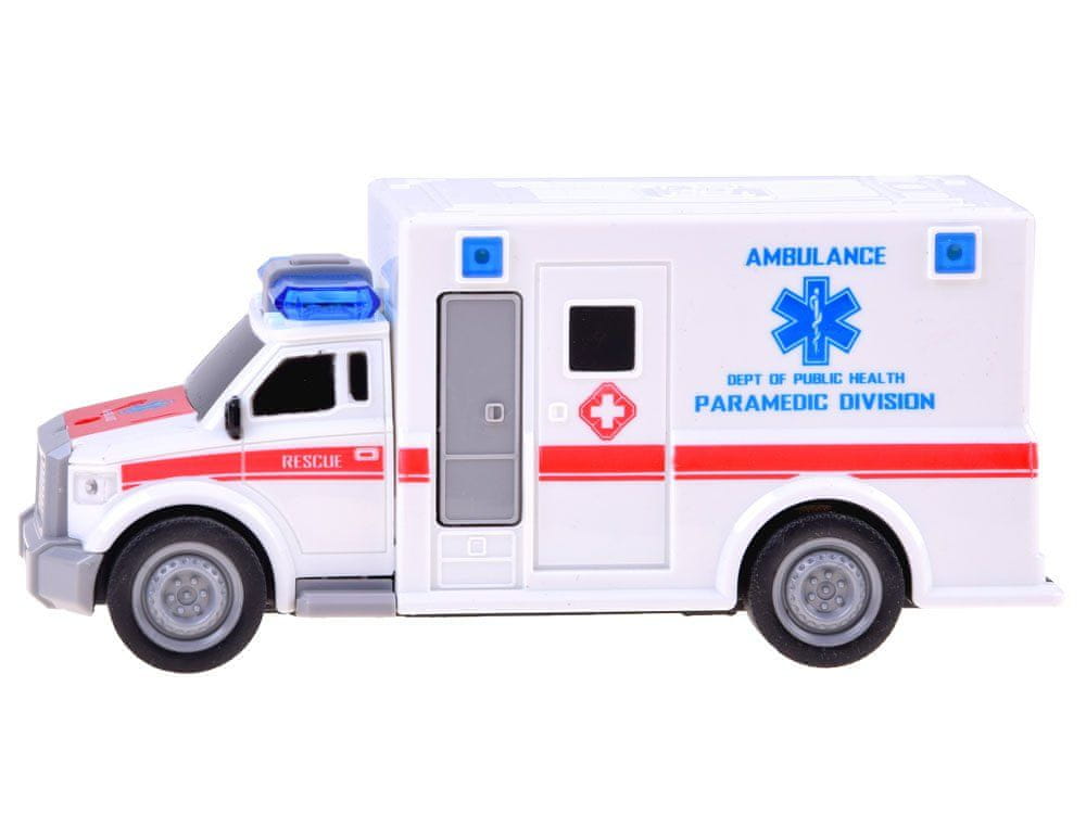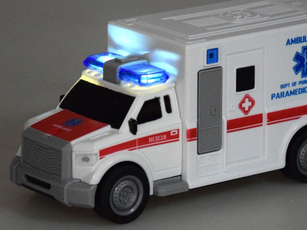 Ambulantni avto v celoti iz plastike, z zvočnimi in svetlobnimi učinki. Bela barva z rdečimi in modrimi elementi zagotavlja, da je vozilo med reševalno akcijo vidno.