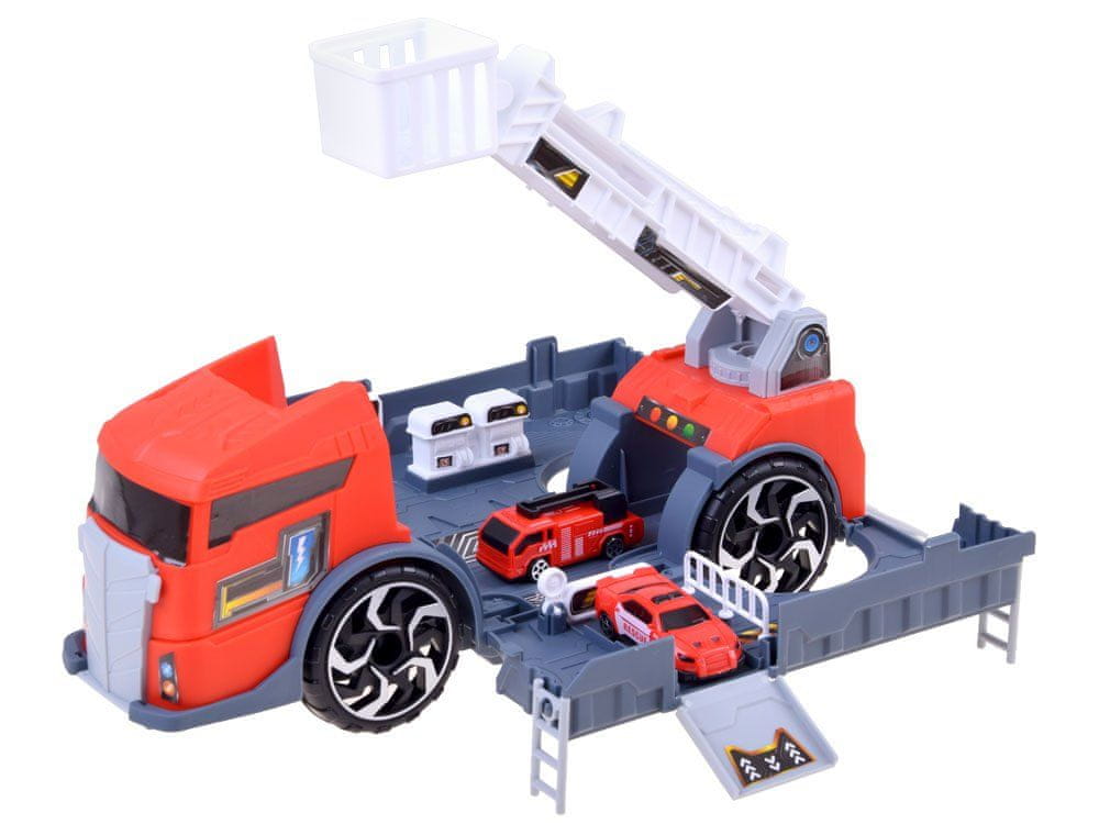 Super večnamenski avto-truckówka na velikih kolesih v rdeči barvi, ki bo odlično darilo za malega ljubitelja avtomobilizma. Konstrukcija vozila in avtomobilov, ki so vključeni v komplet, skupaj z drugimi elementi omogoča, da ga pri igri uporabljate na različne načine, med drugim kot garažo, prikolico, dvigalo.