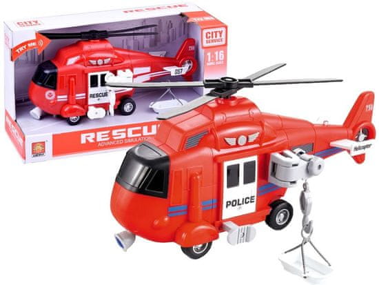 Helikopter je v celoti izdelan iz plastike, ma gumb, pod katerim se skriva zvočni učinek helikopterja, in svetlobne učinke v obliki sijoče bele luči spredaj in rdeče utripajoče luči zadaj. Reševalni helikopter se bo izkazal na več kot eni reševalni odpravi.