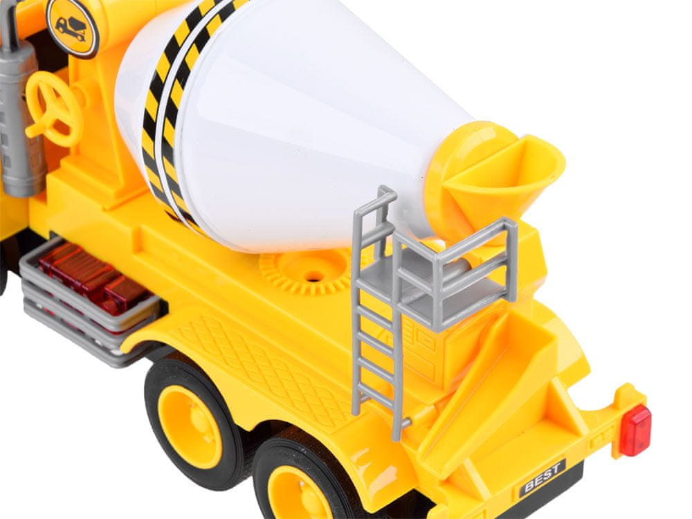 betonski mešalnik gradbeni avto potreben na vsakem gradbišču. Super avto za odlično zabavo za vašega otroka. Mešalnik betona, tako imenovana hruška, je robustno vozilo z vrtljivim sodom. Cev se vrti z ročico. Celoto odlikujeta zelo dobra konstrukcija in lahkotno krmiljenje. Izdelek je izdelan iz visokokakovostne plastike. Avtomobil odlikujejo sodoben videz, pozornost do podrobnosti in barve, ki se ujemajo z vozilom. Komplet je idealen za igro doma, na vrtu ali v peskovniku in je primeren za otroke od 3. leta starosti naprej. Največja zanimivost tovornjaka so realistični zvoki, ki se sprožijo s pritiskanjem na gumbe, nameščene na strehi kabine mešalnika betona.