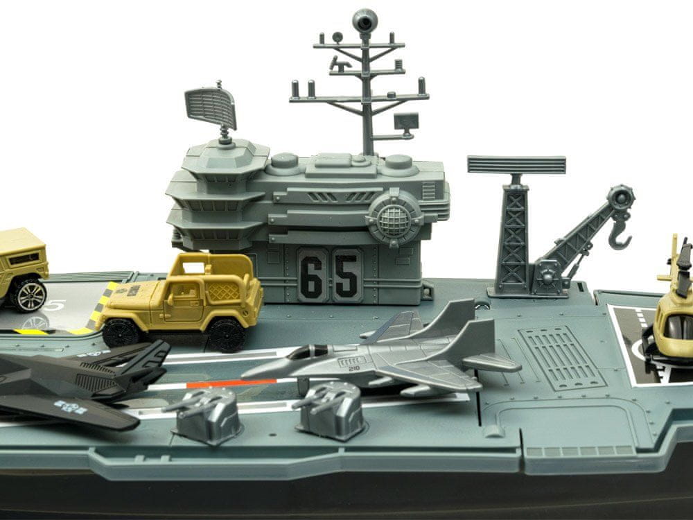 Velika letalonosilka je prava poslastica za poznavalce vojaške opreme. Letalonosilka, skupaj s številnimi vojaškimi letali in vojaškimi vozili, bo zagotovo navdušila vse male in verjetno tudi velike ljubitelje vojaške opreme. Letalonosilka z reaktivci in vojaškimi vozili je izdelana iz plastike, zelo estetsko in natančno. V notranjosti ima predal za shranjevanje neuporabljenih dodatkov.