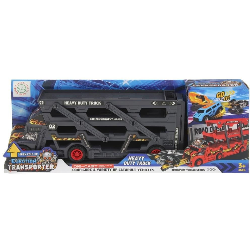 Tovornjak s prikolico za prevoz vozil mora imeti vsak mali zbiratelj zmogljivih avtomobilčkov in drugih prevoznih sredstev. Vlečni tovornjak ima 3 nivoje, namenjene varnemu prevozu in shranjevanju avtomobilčkov, zahvaljujoč katerim vaš otrok ne bo izgubil niti enega dragocenega avtomobila in jih bo lahko prevažal po dirkališčih po vsem svetu. Tovornjak ima tudi zaganjalnik avtomobilov, samo odprite zadnji del tovornjaka in to je to! Če želite zagnati avto, morate raztegniti štrleči del steze, postaviti avto pred njo, pritisniti gumb v obliki črke „U“ na koncu steze in opazovati, kako avto odhiti! Proga poteka skozi najnižji nivo prikolice in izstopa na pokrovu tovornjaka. To je popoln mehanizem za pridobitev prednosti v nori dirki. Polpriklopnik s tremi nivoji, namenjen prevozu avtomobilov, se lahko dvigne tako, da lahko avtomobile enostavno postavite tja. Poleg tega komplet vsebuje zemljevid mesta, ki ga lahko uporabite za dirkališče, pisane avtomobile in prometne znake.