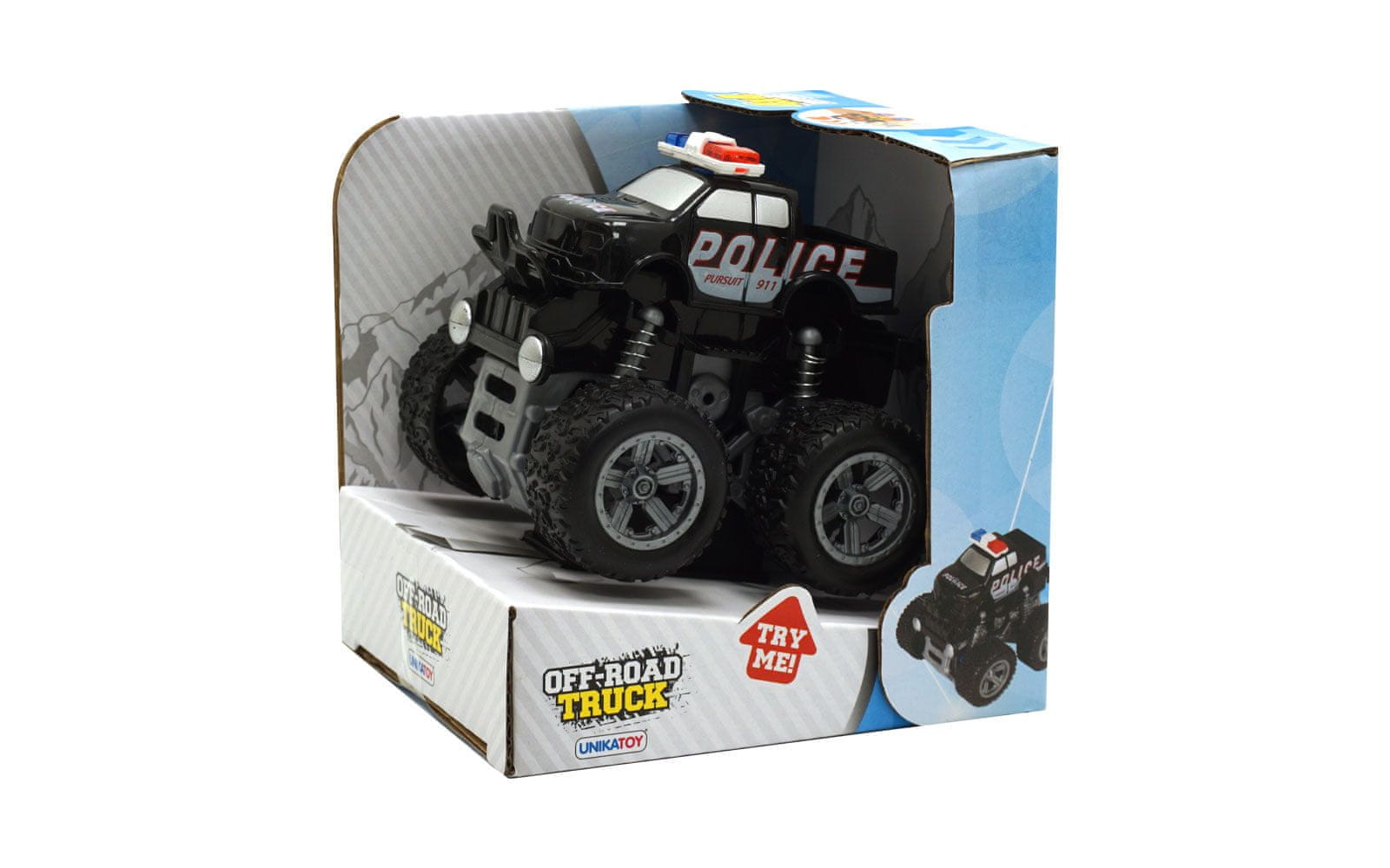 Policijski off road džip priznane blagovne znamke Unikatoy je velikosti 9 cm. Vozilo ima velika kolesa, super vzmetenje ter je atraktivnega videza. Na voljo v dveh različnih stilih. Izdelek je primeren za otroke od 3. leta starosti dalje.