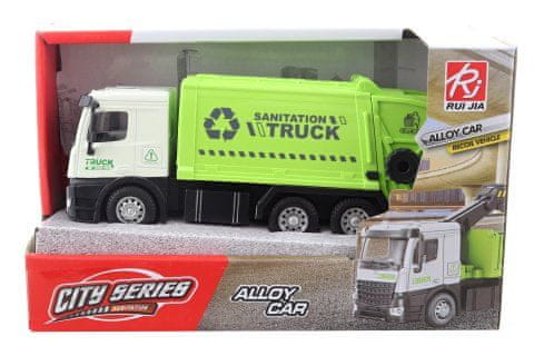 Tovornjak za smeti z vzvratno vožnjo. Material kovina + plastika. Zadnji del na tečajih. Pakirano v odprti škatli. Dimenzije paketa približno 20×13×9 cm. Dimenzije avtomobila približno 16,5×7×5 cm. Starost 3+