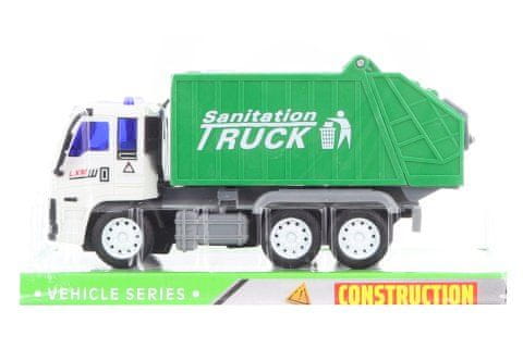 Tovornjak za smeti na vztrajniku. Dimenzije približno 20 × 9,5 × 6,5 cm. Dimenzije paketa približno 23 × 12 × 9 cm. Starost 3+