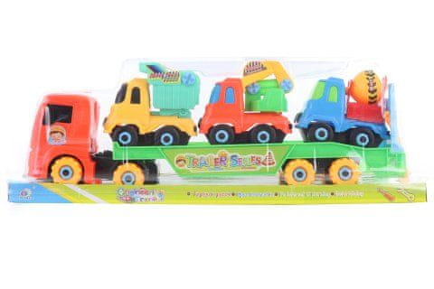 Plastični tovornjak z vijaki in tremi gradbenimi stroji. Dimenzije tovornjaka približno 39 × 9 × 7 cm. Velikost avtomobilov približno 9,5 × 9,5 × 6 cm. Velikost paketa približno 43 × 15,5 × 10 cm. Starost 3+