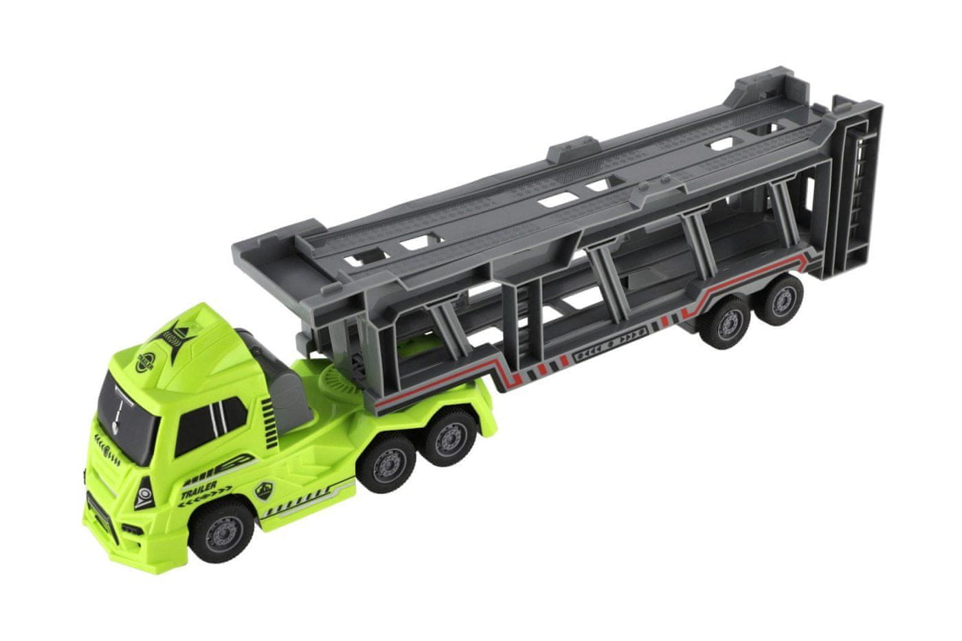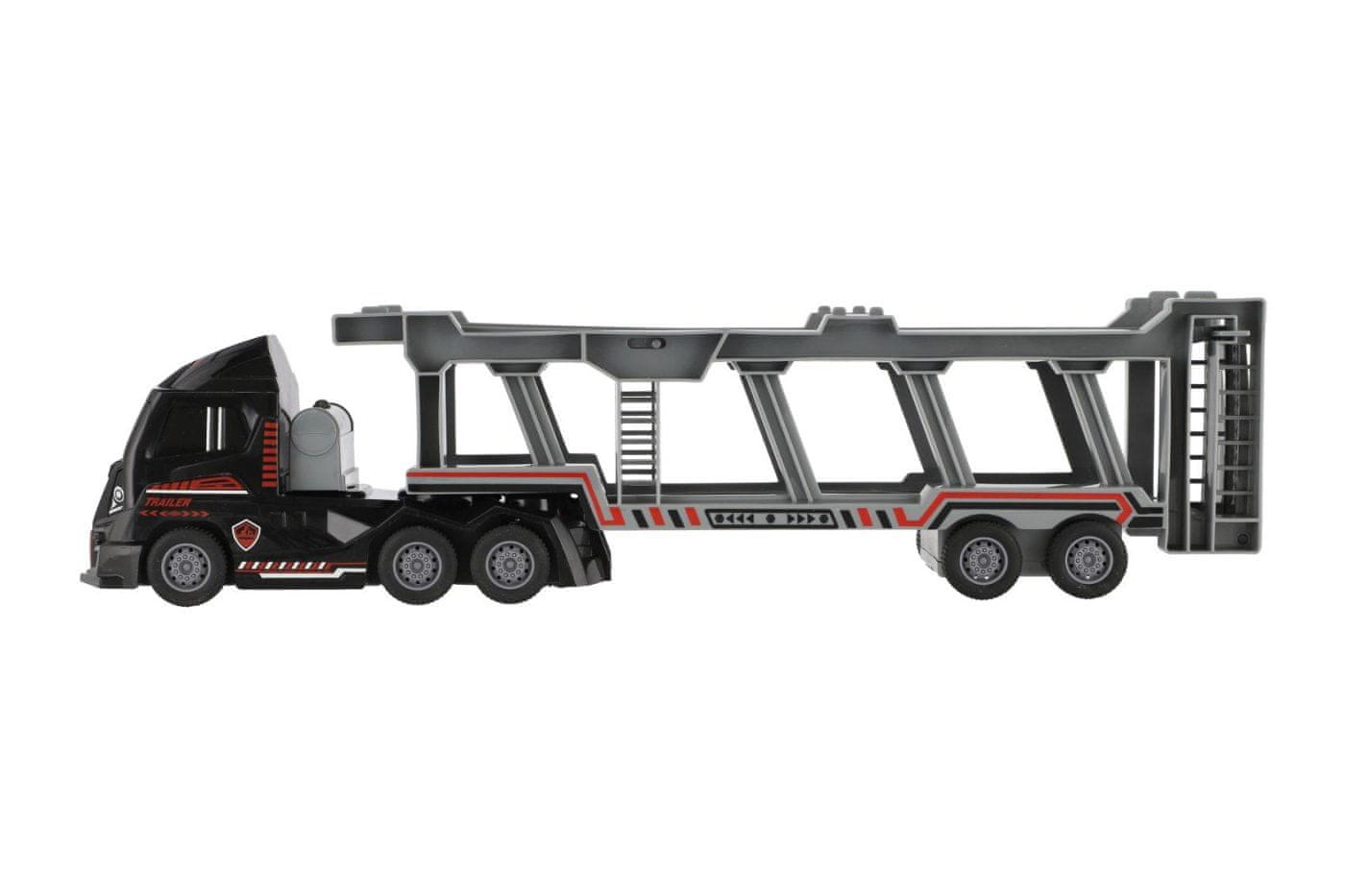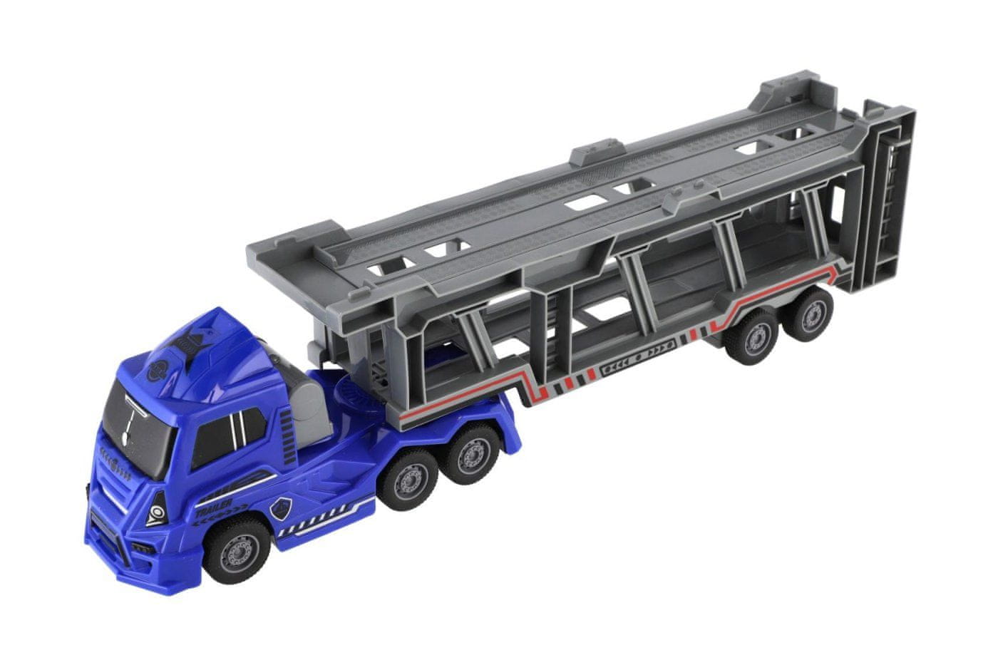Izvedi policijsko intervencijo s kul tovornjakom prevoznikom! Ta velik plastični vlačilec z realistično obliko in pogonom na vztrajnik prevaža tri različne policijske avtomobile, ki jih je mogoče zaradi funkcionalne rampe enostavno odstraniti in ponovno naložiti. Dvonadstropna prikolica je nagibna in zagotavlja odlično igralnost ter prostor za shranjevanje vozil.