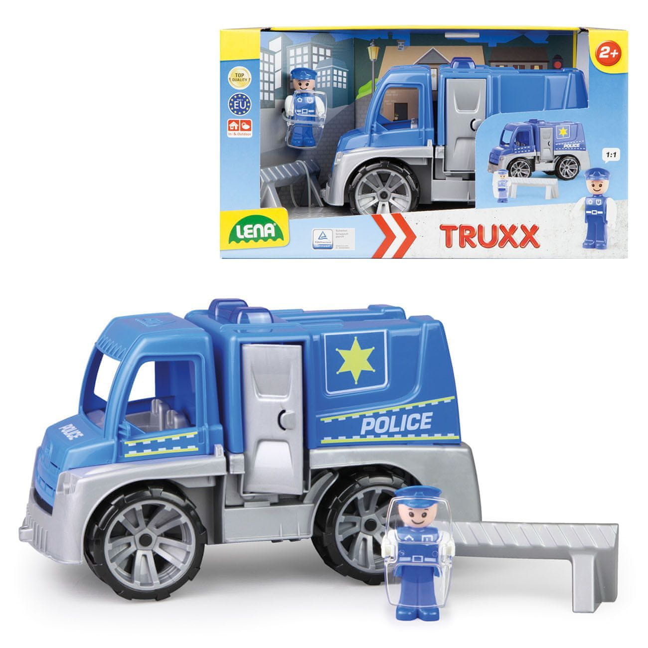 • V kompletu: policijski avto, figura policista, policijski ščit, cestna zapora, nalepke.