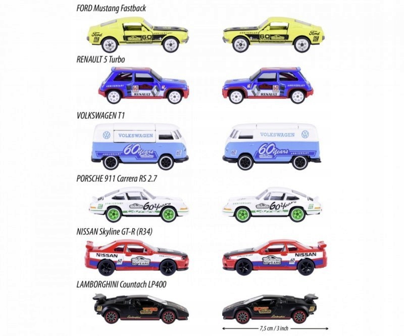 Modeli Majorette 60th Anniversary so luksuzna rojstnodnevna izdaja, ki vsebuje 6 ikoničnih modelov iz 60 let avtomobilske zgodovine, vsak avtomobil pa predstavlja estetiko predstavljene avtomobilske dobe: