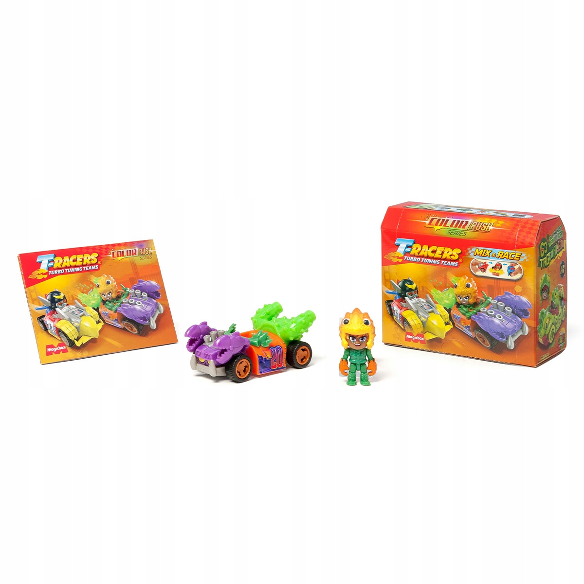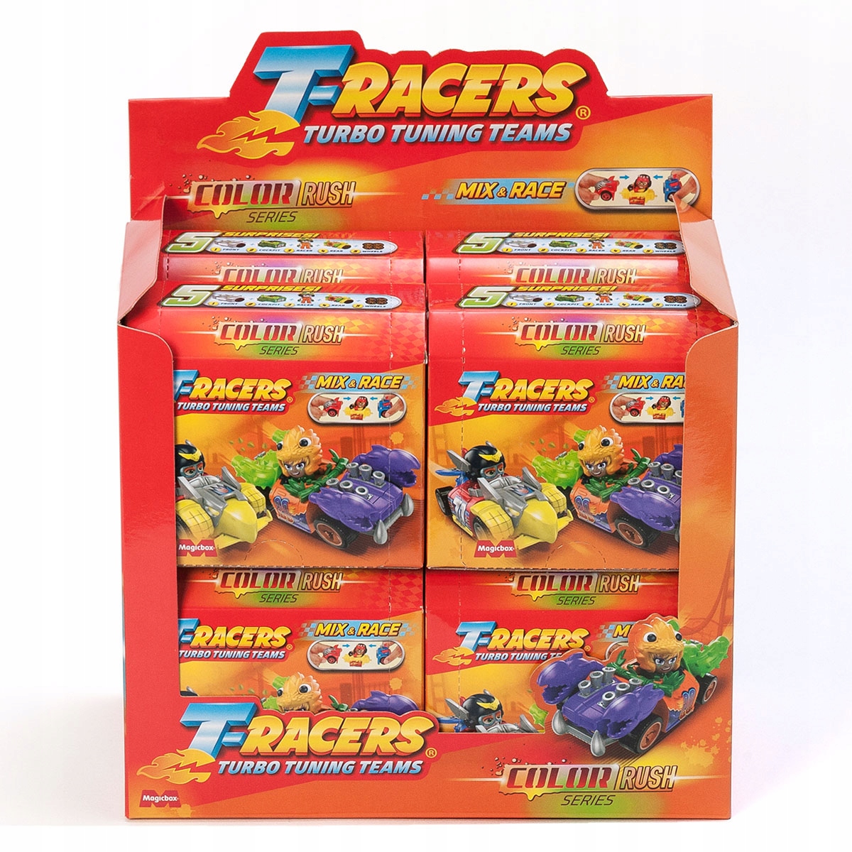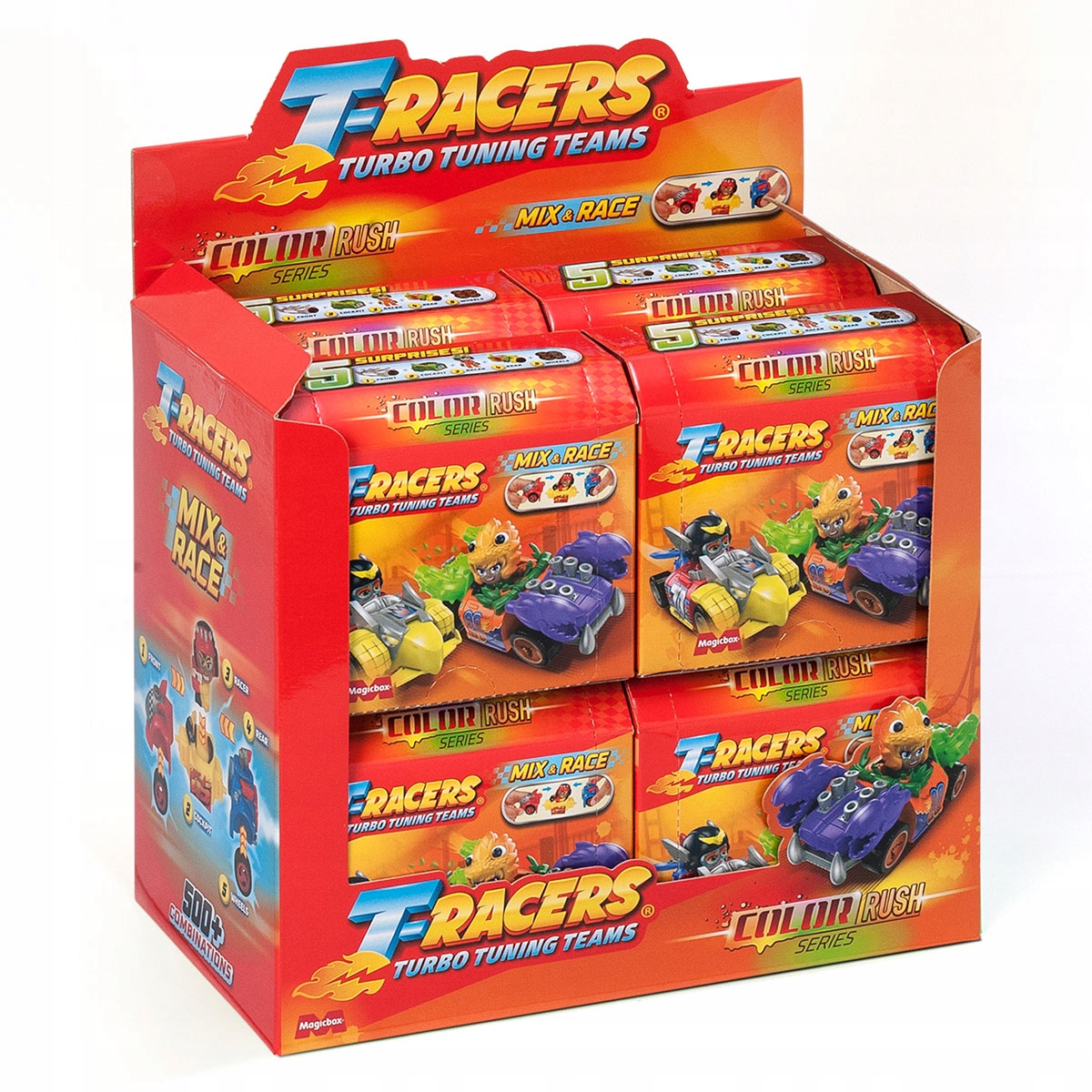 T-dirkači so nazaj v novi seriji Color Rush! Spoznajte 8 novih voznikov, nove avtomobile in njihove moči. Ne pozabite, da lahko vse dele zamenjate z drugimi T-dirkači – sprednji del, zadnji del, kokpit, kolesa, celo voznike … Možne kombinacije so neskončne! Boste našli ultra redkega Tagmaleona? Spreminja barvo s toploto!