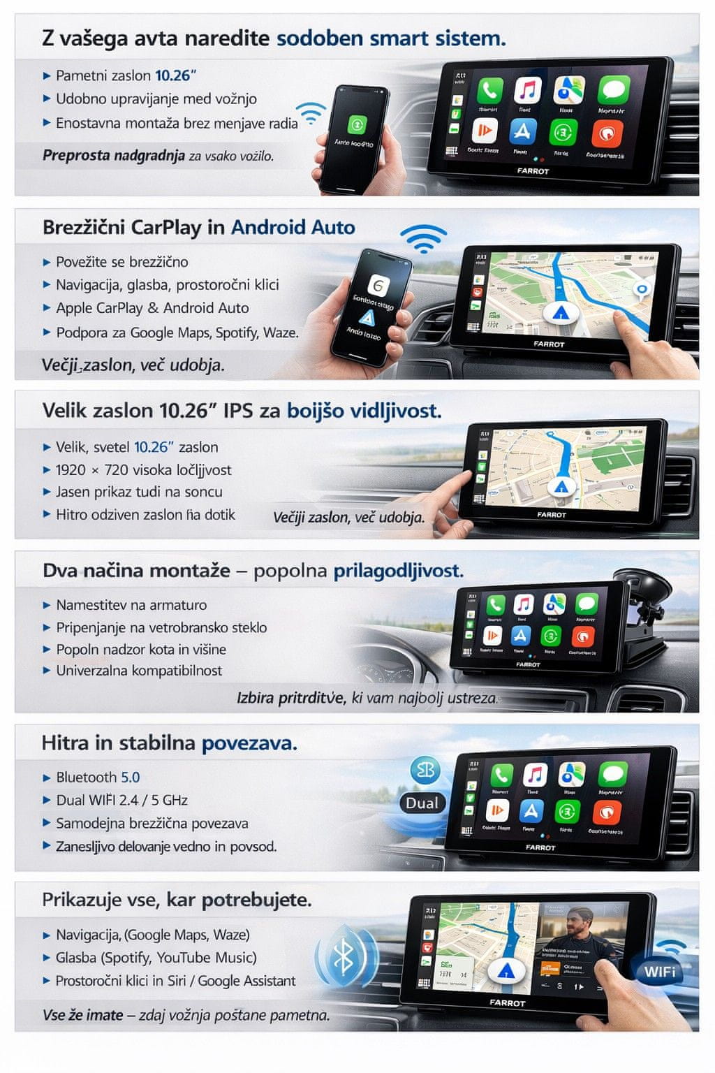 Ne potrebujete novega avtomobila, da vozite moderno. FARROT 10.26" zaslon spremeni vaše vozilo v pametni multimedijski sistem v nekaj minutah. Navigacija, glasba in klici – vse na velikem zaslonu, vedno pred vašimi očmi. To ni dodatek. To je nadgradnja vaše vožnje.