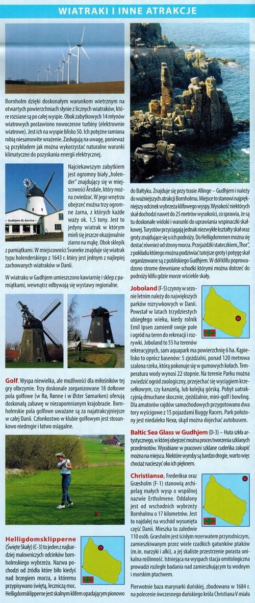 Zložljiv turistični zemljevid Bornholma v merilu 1 : 45.000. Zemljevid lahko uporabljajo tako pohodniki kot kolesarji. Zemljevid prikazuje trenutne pohodniške in kolesarske poti ter zemljevide mest Ronne in Nexo. Na hrbtni strani je turistični opis najpomembnejših znamenitosti otoka. Legenda je v poljščini, nemščini in danščini.