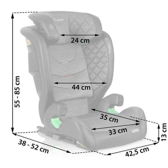 2-položajna nastavitev kota naklona, namestitev ISOFIX, Odstranljiva in pralna prevleka. Ustreza evropskim varnostnim standardom ECE R129 – odobritev i-Size. Zasnovan za otroke, visoke 100–150 cm (primerno za 4–12 let), 4-točkovne vzdržljive pritrdilne točke za varnostni pas, Okrepljena zaščita pred udarci zahvaljujoč materialom stranskih odbojnikov, 12-položajna nastavitev vzglavnika – sedež raste z vašim otrokom,
