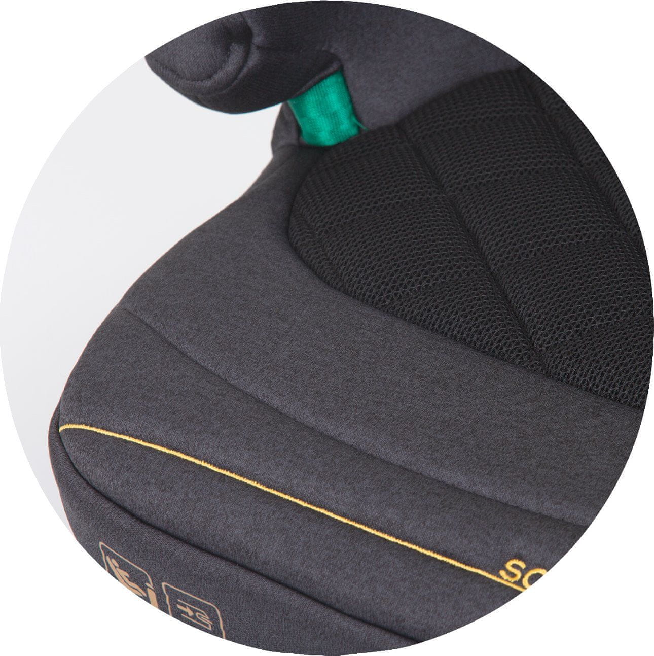 2 možnosti pritrditve v vozilo: 1) ISOFIX + varnostni pas vozila ali 2) samo varnostni pas vozila, otrok je pripet s tritočkovnim varnostnim pasom vozila, intuitivna in priročna namestitev s sistemom ISOFIX = hiter način namestitve otroškega sedeža – sistem ISOFIX zmanjša sile, ki delujejo na otroka v primeru nenadnega zaviranja vozila, udobna opora za hrbet, prostoren sedež z ergonomsko obliko, udobni nasloni za roke, udobna prevleka – lahko se odstrani in opere.