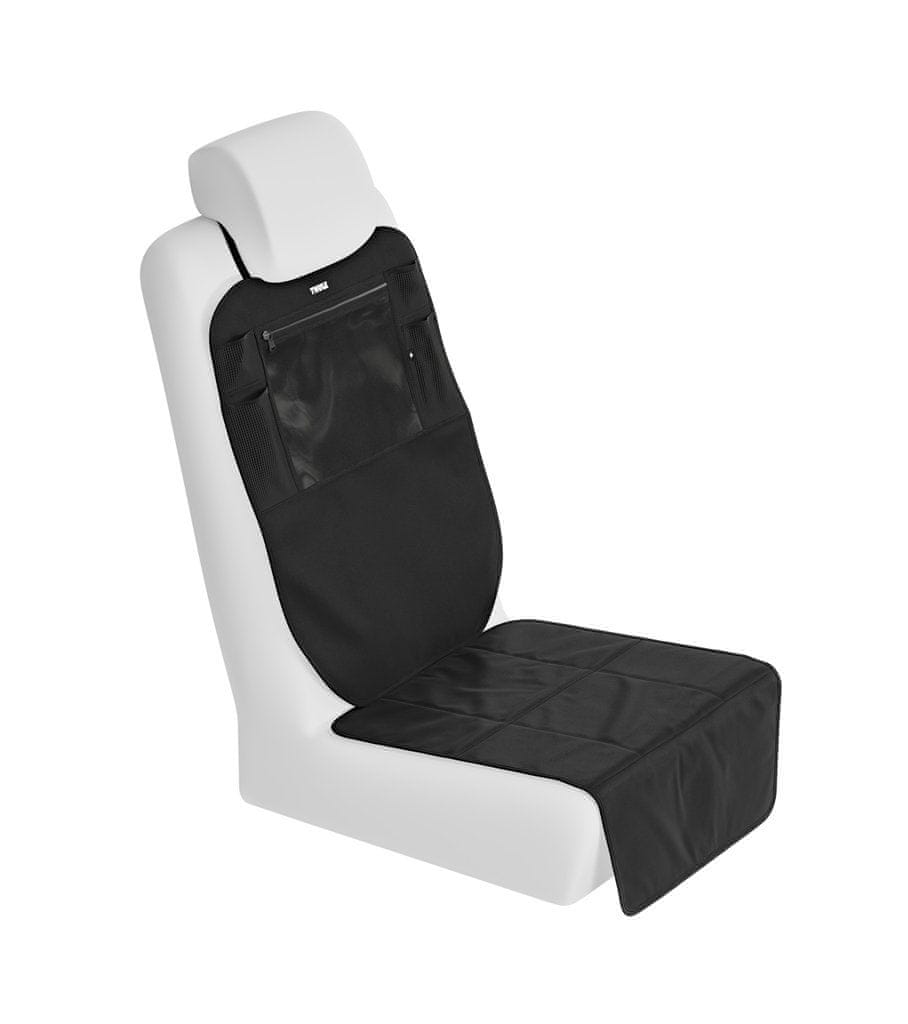 Vsestranska zaščita Ta po višini nastavljiva zaščita sedeža ponuja dvodelno popolno zaščito – en del ščiti zadnji sedež, drugi pa se prilega pod otroški avtomobilski sedež. Ima žep za iPad in velike žepe za shranjevanje igrač, poleg tega pa ima še štiri dodatne mrežaste predale za shranjevanje. Žep za iPad se zapira z zadrgo in je preizkušen z avtomobilskimi sedeži Thule. Zaščito sedeža je mogoče prati v pralnem stroju pri 30 stopinjah za lažje vzdrževanje.