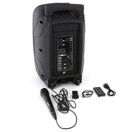 Ključne funkcije: – Vgrajen je sistem za upravljanje glasnosti: Frekvenčno območje: 100 Hz-20 kHz Predvajanje: bluetooth 2.1 , USB, kartica microSD, vhod AUX, vhodni priključek za karaoke 6,3 mm Funkcija karaoke – mikrofon je vključen Določljivost bluetooth do 10 m, protokol prenosa zvoka A2DP Napajanje: baterija 2400 mAh Polnjenje: V paketu: daljinski upravljalnik (priložena baterija CR2025), mikrofon (3m kabel), kabel microUSB, zvočni kabel Jack-Jack 3,5 mm Občutljivost: Mere: 250×220×410 mm, barva: črna Vgrajena baterija: da Kapaciteta baterije [mAh]: 2400 Za delovanje na baterijo: da Barva: Višina [mm]: 220 Širina [mm]: 250 Globina [mm]: 250: Mikro USB: da Mikro USB: da USB 2.0: da