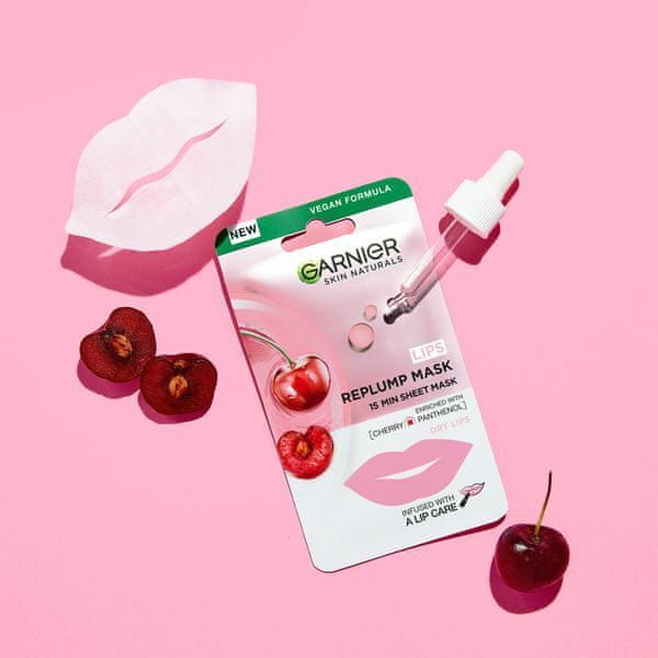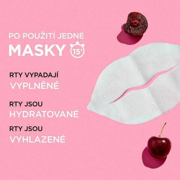 Polnilna tekstilna maska za ustnice z izvlečkom češnje in pantenolom. Za napolnjene, navlažene in zglajene ustnice v samo 15 minutah.