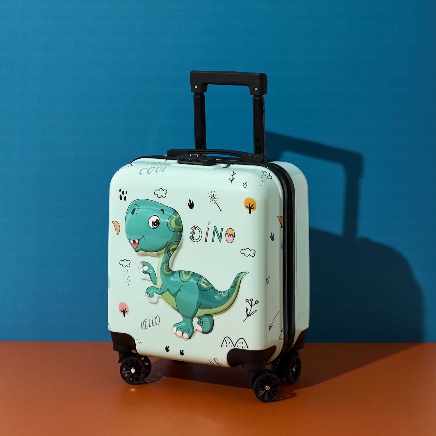 Ta barvit otroški kovček z motivom dinozavra je popoln spremljevalec za male popotnike. Njegova trpežna in lahka konstrukcija velikosti kabine iz trde ABS plastike ščiti njegovo vsebino, medtem ko štiri kolesa, vrtljiva za 360°, zagotavljajo udobno manevriranje, tudi za otroke. Vgrajena kombinirana ključavnica poveča varnost prtljage, teleskopski ročaj pa se prilagodi poljubni višini. Notranjost je opremljena s praktičnimi predali in varnostnimi trakovi. Popoln za počitnice, šolske izlete ali vikend pri starih starših – eleganten in varen!