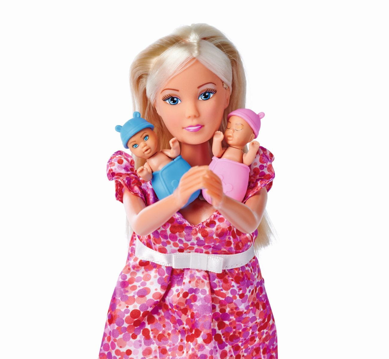 Noseča lutka Steffi z dojenčkom presenečenjem in več kot 11 dodatki. Bo to deček, deklica ali dvojčka? Velikost lutke 29 cm. 3 vrste.