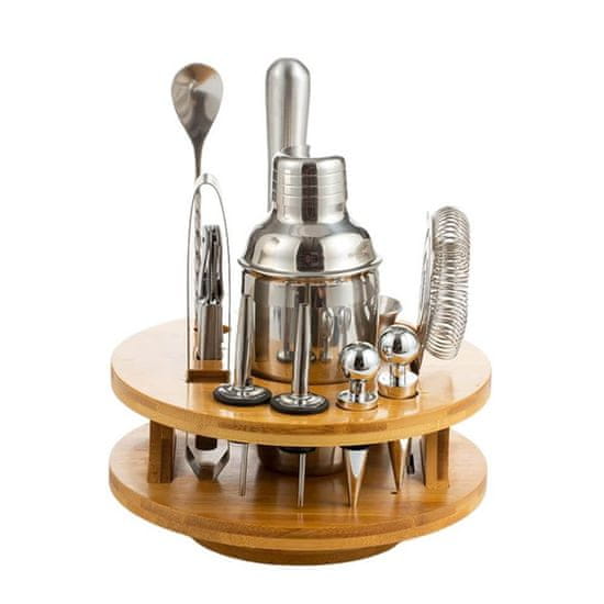 Vsaka komponenta je izdelana iz vrhunskih materialov, ki zagotavljajo dolgo življenjsko dobo in vzdržljivost. Shaker za koktajle in drugi kovinski deli so izdelani iz nerjavečega jekla, ki je odporno proti koroziji in enostavno za čiščenje. Stojalo iz bambusa ne samo da poskrbi za urejenost vaše posode, ampak tudi doda naraven in moderen videz vaši kuhinji ali baru.