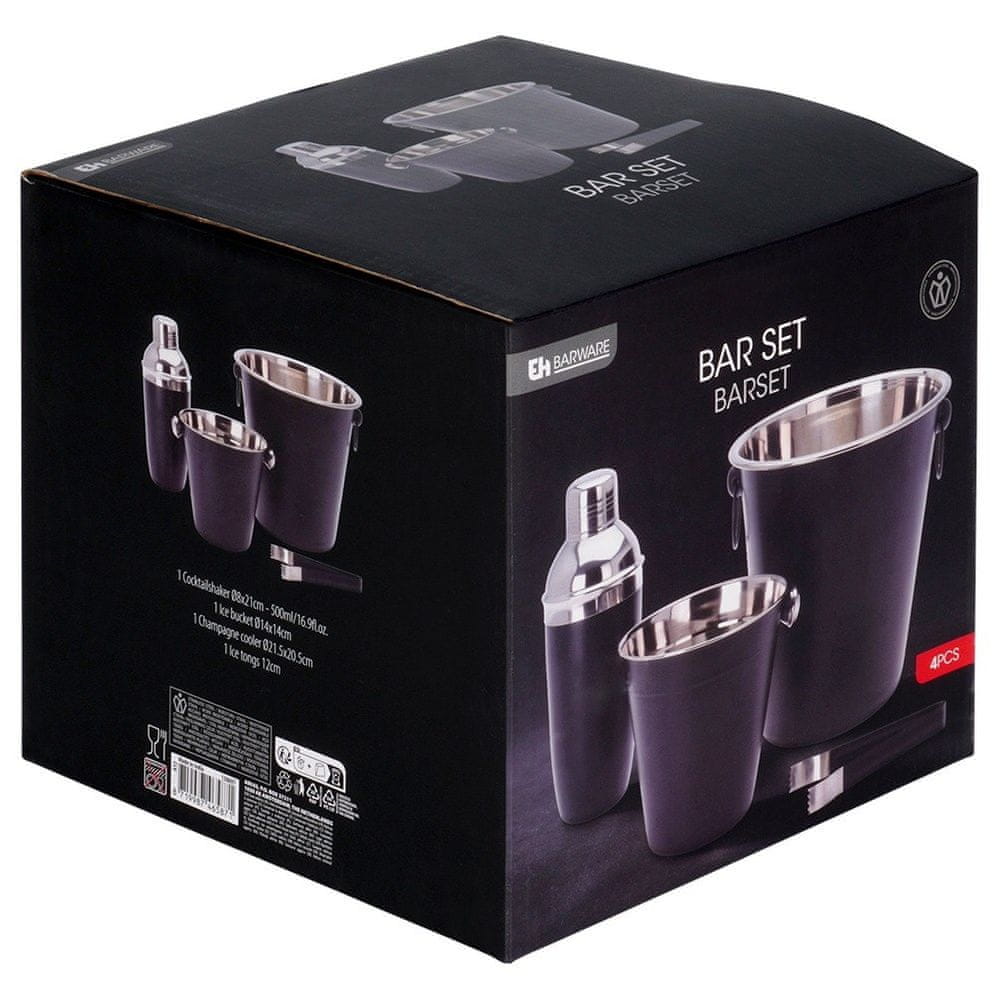 Komplet za barmana, ki vsebuje vse potrebne dodatke za pripravo pravih koktajlov in pijač. Komplet vsebuje: 1× majhno vedro (premer 14 cm, višina 13 cm), 1× veliko vedro (premer 21,5 cm, višina 21 cm), 1× stresalnik (višina 21 cm, premer 8 cm), 1× klešče (dolžina 14 cm). Ta komplet je primeren tako za domačo uporabo kot za profesionalne bare. Omogočil vam bo, da presenetite svoje goste z izjemnimi koktajli in pijačami. Izdelano v skladu z evropskimi standardi.