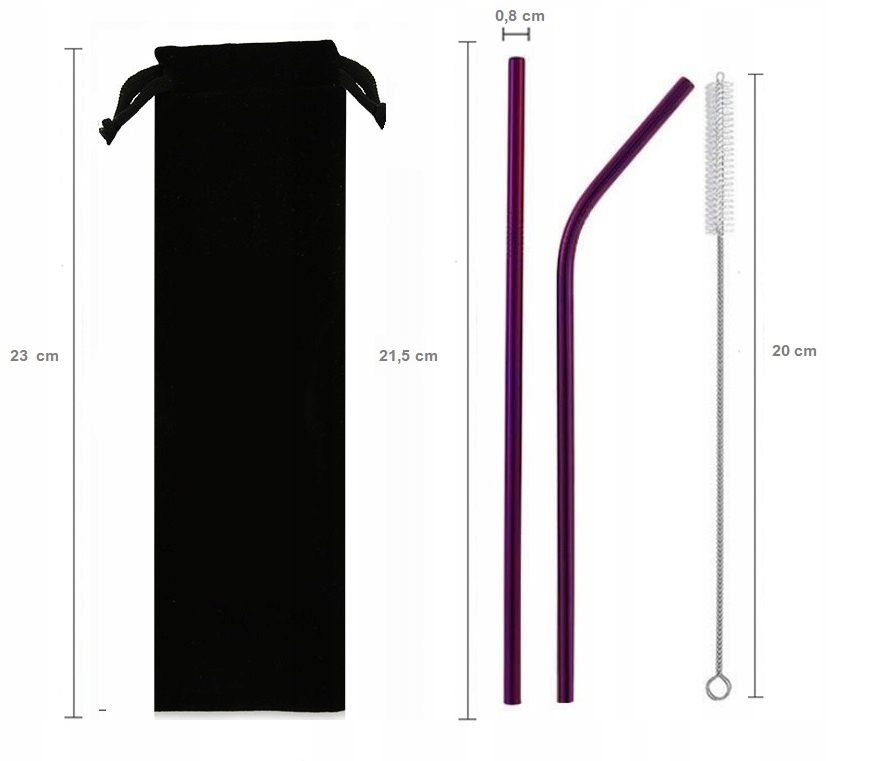 Set 4 vijoličnih jeklenih slamic 215×8 mm, z vrečko in čistilom