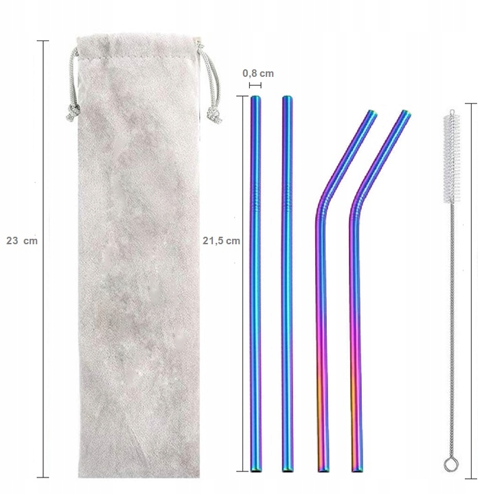 Set 4 mavričnih jeklenih slamic 215×8 mm, plus vrečka in čistilo