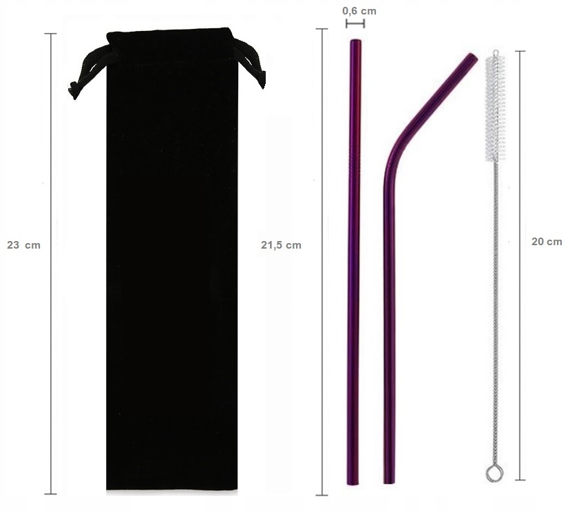 Set 8 vijoličnih jeklenih slamic 215×6 mm, vrečka in čistila