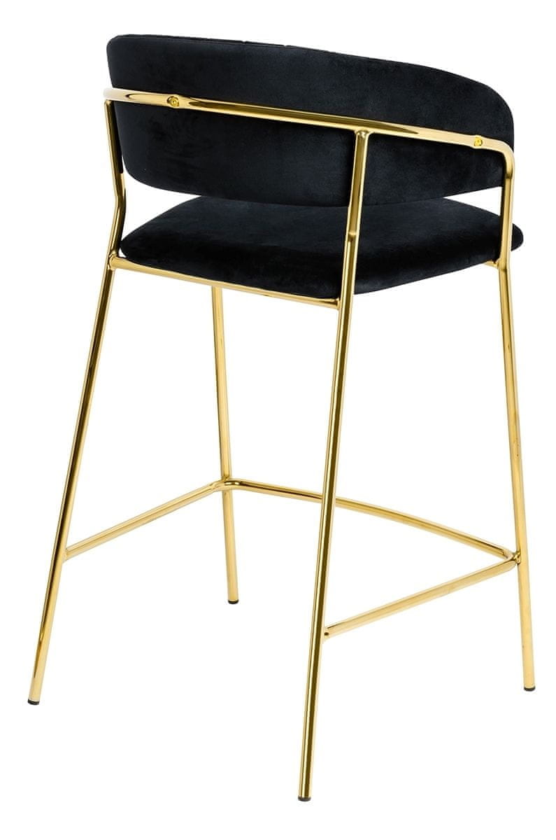 Hocker Margo v črni barvi. Sedež in naslonjalo sta oblazinjena z mehkim in na otip prijetnim velurjem. Močna in stabilna konstrukcija je izdelana iz kovine zlate, svetleče barve. Sijajna zlata barva. Ključavnica Margo je popolna kombinacija modne tkanine in zlate barve. kombinacija modne tkanine in zlate barve. Navpični šivi na naslonjalu dodajajo eleganco.