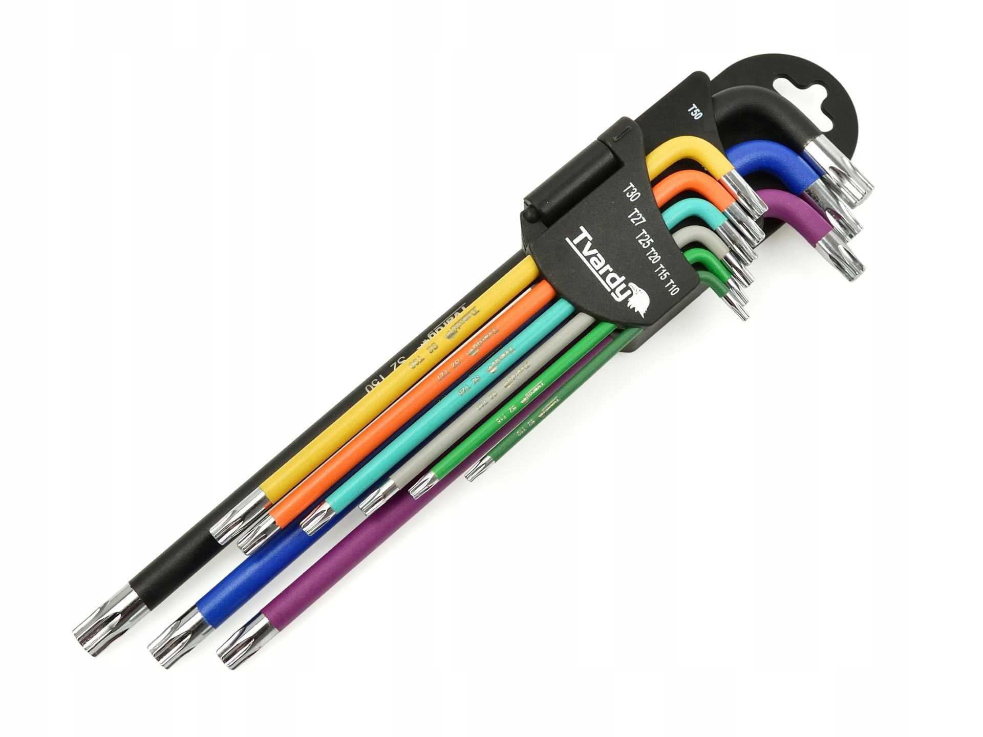 Komplet dolgih ključev Torx profesionalne znamke orodij Tvardy . Izdelano iz visokokakovostnega jekla S2 za katerega je značilna veliko večja trdnost kot običajno uporabljeno orodno jeklo CrV . Dolžina tipk omogoča delo na težko dostopnih mestih. Različne barve tipk olajšajo izbiro prave velikosti tipk.