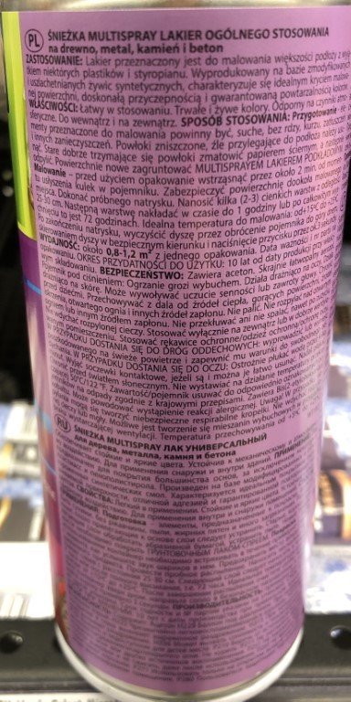 Univerzalna zelena sijajna barva v spreju ✅ ŚNIEŻKA Univerzalna zelena sijajna barva v spreju 400 ml je barva za univerzalno uporabo. Izdelana je iz modificiranih in rafiniranih sintetičnih smol. Odlikuje jo popolna prekrivnost, visok sijaj in zagotovljena ponovljivost barve. Zakaj se splača kupiti? ⭐ Zagotavlja dolgotrajno in živahno barvo ⭐ Odporna na vremenske vplive in mehanske dejavnike ⭐ Za zunanjo in notranjo uporabo ⭐ Enostaven nanos Navodila za uporabo? 1️⃣ Pred nanosom očistite in posušite površino. Odstranite poškodovane plasti oljne barve, ki se slabo oprimejo podlage, in jih očistite rje, umazanije in drugih nečistoč. 2️⃣ Po potrebi izpostavljeno površino premažite s temeljnim premazom in zbrusite stare, dobro oprijete plasti barve. 3️⃣ Pred uporabo pločevinko stresajte približno 2 minuti, dokler ne zaslišite stiskanja kroglic. Zaščitite površine okoli območja, ki ga barvate. 4️⃣ Naredite testno pršenje. Nanesite več 2–3 tankih plasti z razdalje 25–39 cm. Naslednji sloj nanesite v 2 urah ali po 24 urah. Idealna temperatura za barvanje od +15 °C do +25 °C. 5️⃣ Po pršenju očistite šobe tako, da posodo obrnete na glavo, usmerite šobo v varno smer in pritisnete gumb približno 3 sekunde. Parametri: ⭐Znamka: Śnieżka ⭐Barva: Sijajno zelena ⭐Prostornina: 400 ml ⭐Učinkovitost: 0,8–1,2 m2 iz enega pakiranja ⭐Uporaba: Univerzalna Cena velja za en kos VARNOST ❗️ Vsebuje aceton. Zelo vnetljiv aerosol. Posoda pod tlakom. Lahko eksplodira pri segrevanju. Povzroča draženje oči. Povzroča draženje kože. Lahko povzroči zaspanost ali omotico. Hraniti izven dosega otrok. Hraniti ločeno od vročine, vročih površin, isker, odprtega ognja in drugih virov vžiga. Ne kadite. Ne pršite v odprt ogenj ali drug vir vžiga. Ne preluknjajte in ne sežigajte. Ne vdihavajte razpršila. Uporabljajte na prostem ali v dobro prezračevanem prostoru. Nosite zaščitne rokavice in zaščitna oblačila. ❗️ V primeru vdihavanja: Osebo odnesite na svež zrak in ji zagotovite udoben položaj za dihanje. ❗️ V primeru stika z očmi: Previdno izpirajte z vodo nekaj minut. Zaščitite pred sončno svetlobo.