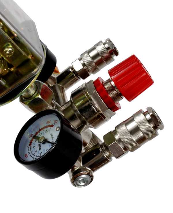 Stikalo ima dva hitra priključka, dve uri in gumb za nastavitev izhodnega tlaka.
